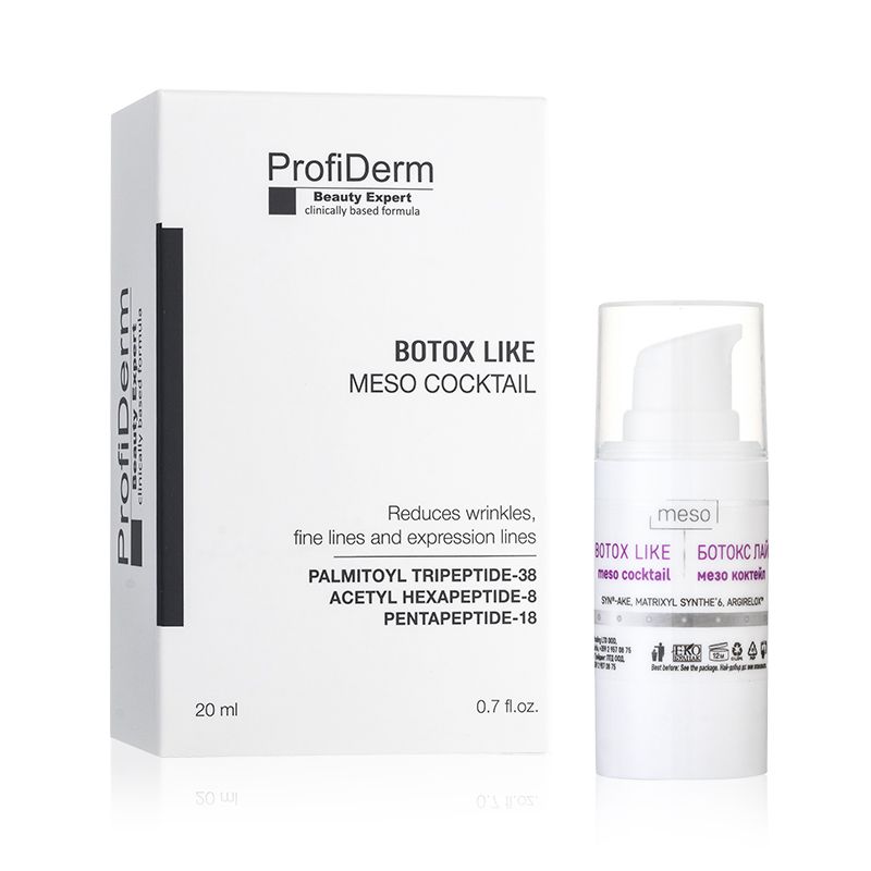 The unique formula of the Botox like Meso Cocktail from ProfiDerm is designed to combat the appearance of early expression lines and fine wrinkles. It visibly tightens the skin, enhancing its smoothness and elasticity. The cocktail works by inhibiting muscle activity to prevent the initial formation of wrinkles, without causing harm to the skin. It delivers hyaluronic acid to the dermal layer of the skin.